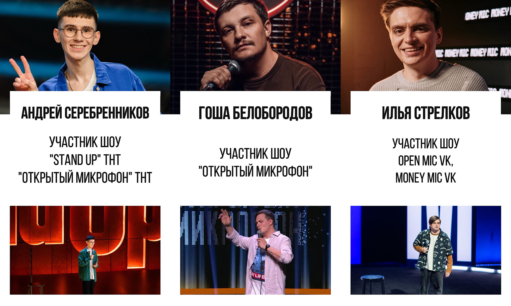 В программе опытные московские комики, в том числе участники ТВ и YouTube проектов.