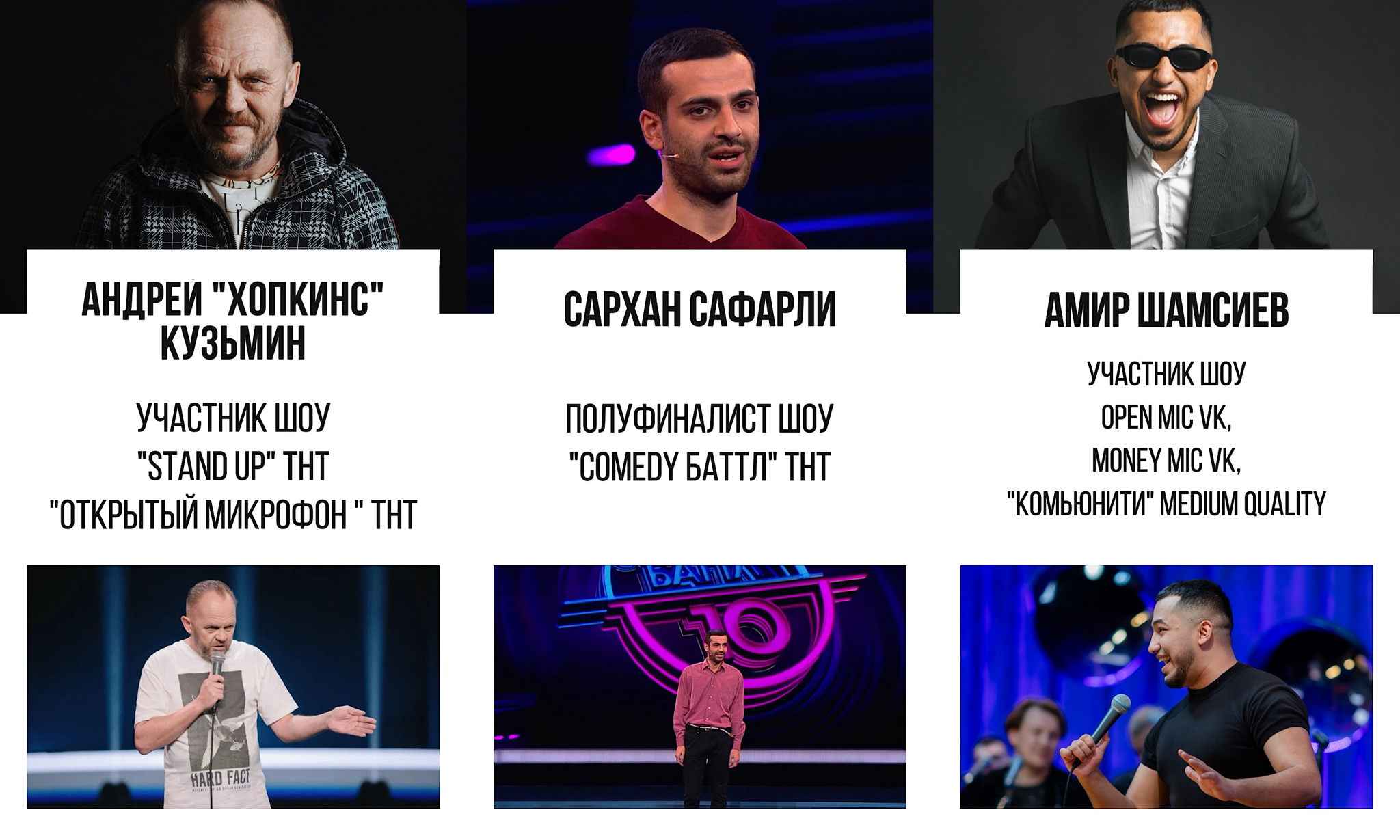 В программе опытные московские комики, в том числе участники ТВ и YouTube проектов.