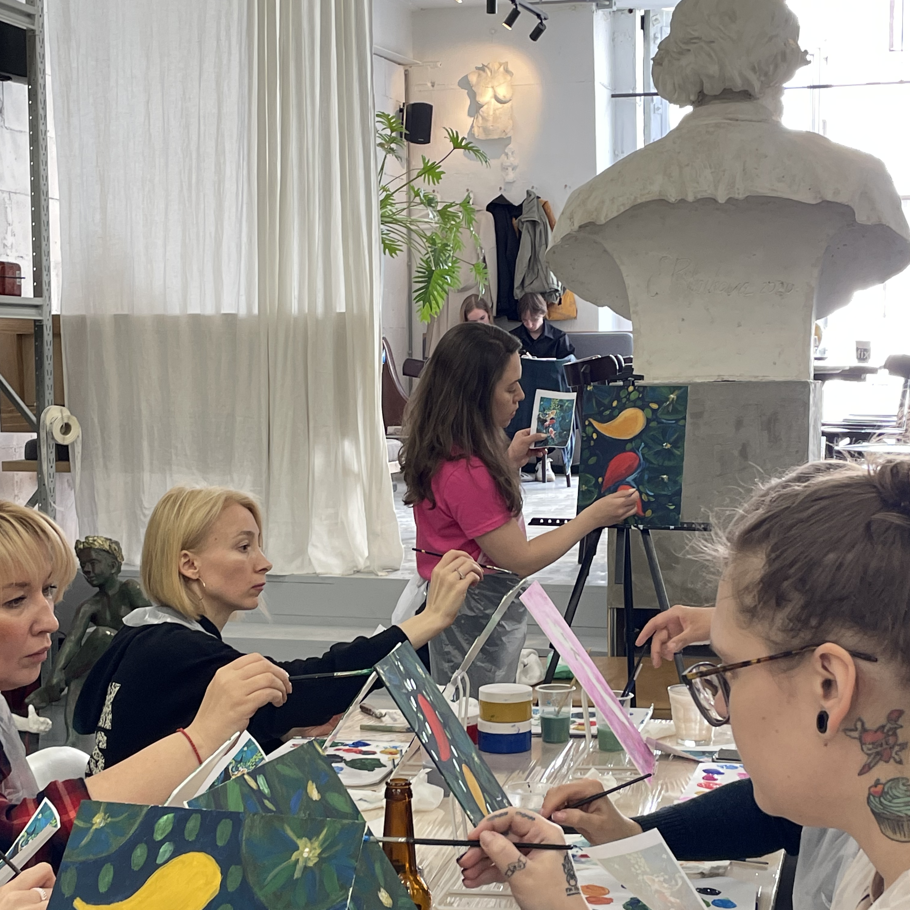 В уютном пространстве белой студии ArtMe с высокими потолками и арочными окнами всё располагает к творчеству. Здесь мы учимся работать с красками и понимать формы. Отпускаем любые заботы, погружаясь всеми мыслями и чувствами в творческий процесс. На мастер-классе изучаем основы живописи и посвящаем время себе. Возможно, для кого-то в этот день исполнится мечта — взять кисти в руки и написать первую картину. Занятие составлено для любого уровня подготовки: даже если вы не рисовали со времён школы, ваших зверюшек никто не узнаёт, а домики похожи на кубики — вы напишете прекрасную картину. К нам приходят получить удовольствие, расслабиться и отдохнуть. Урок длится 3 часа с перерывами на чашечку кофе и приятный комплимент к ней. Холст, акриловые краски и все материалы предоставляем мы. Живое общение любящих эту жизнь людей.