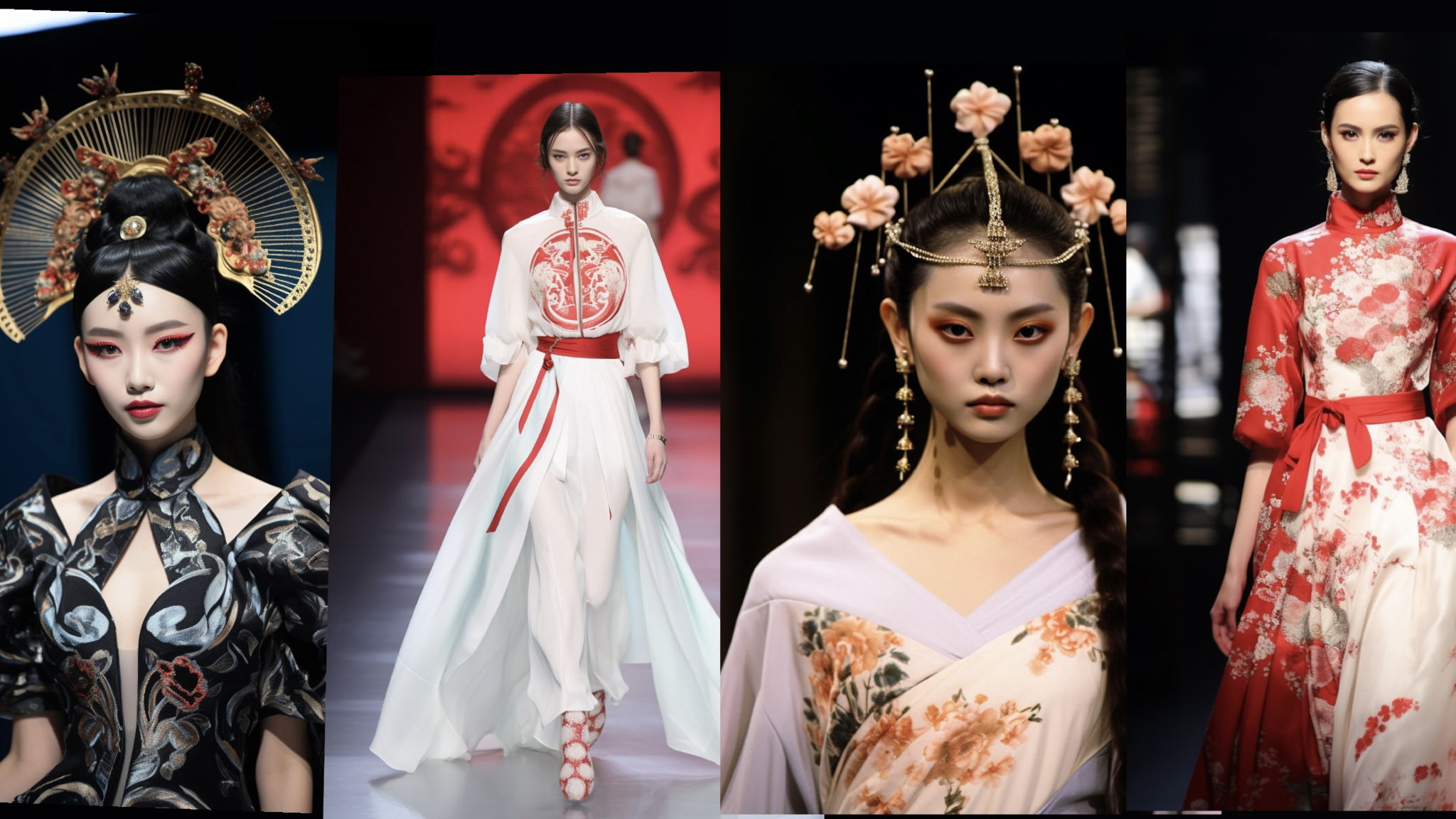 Яркий макияж, зонты и веера, шелк и традиционный красный цвет.